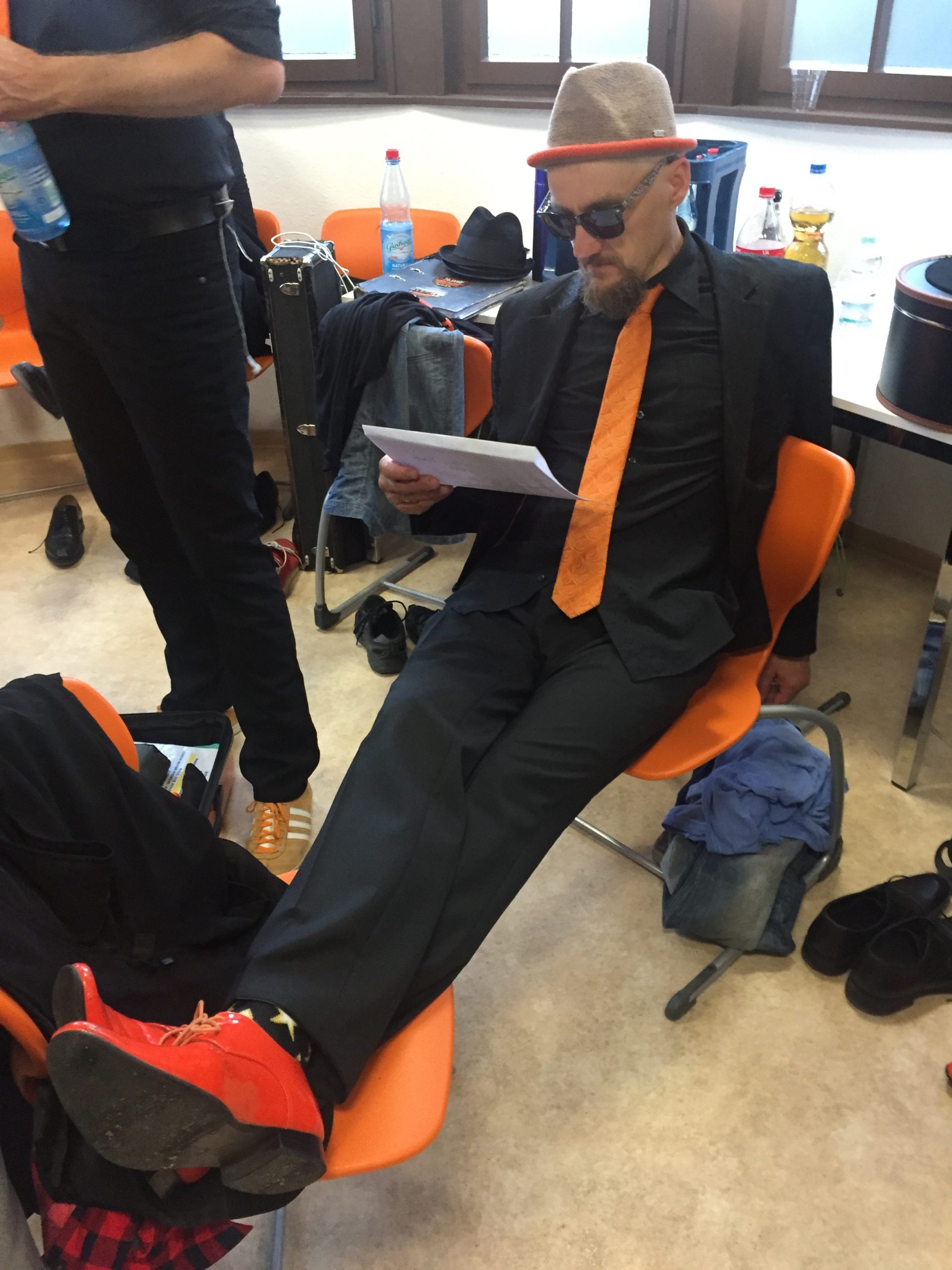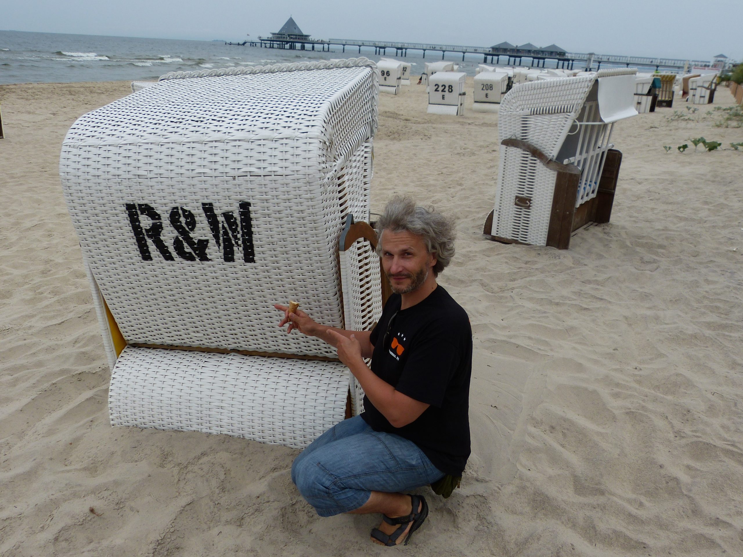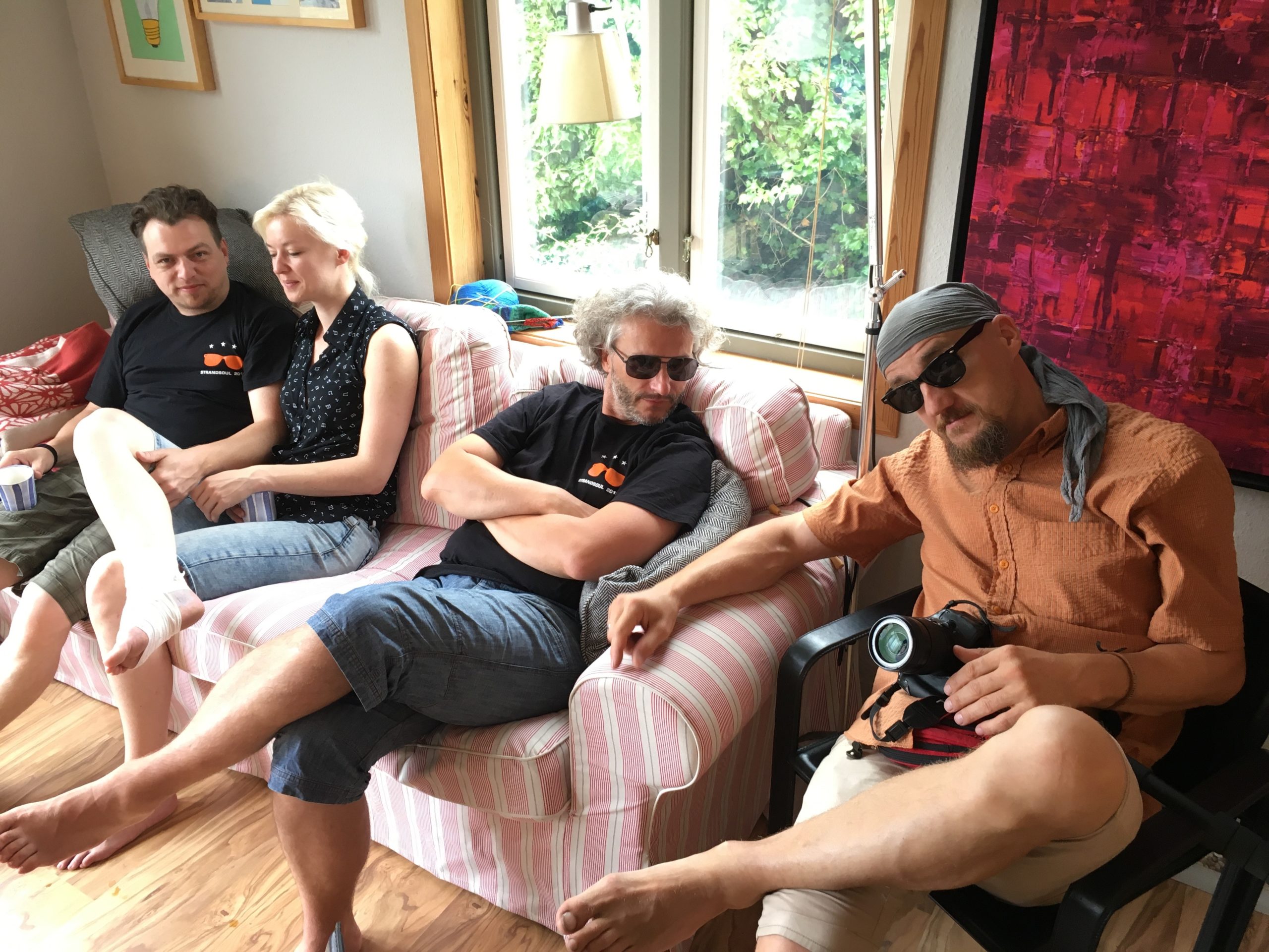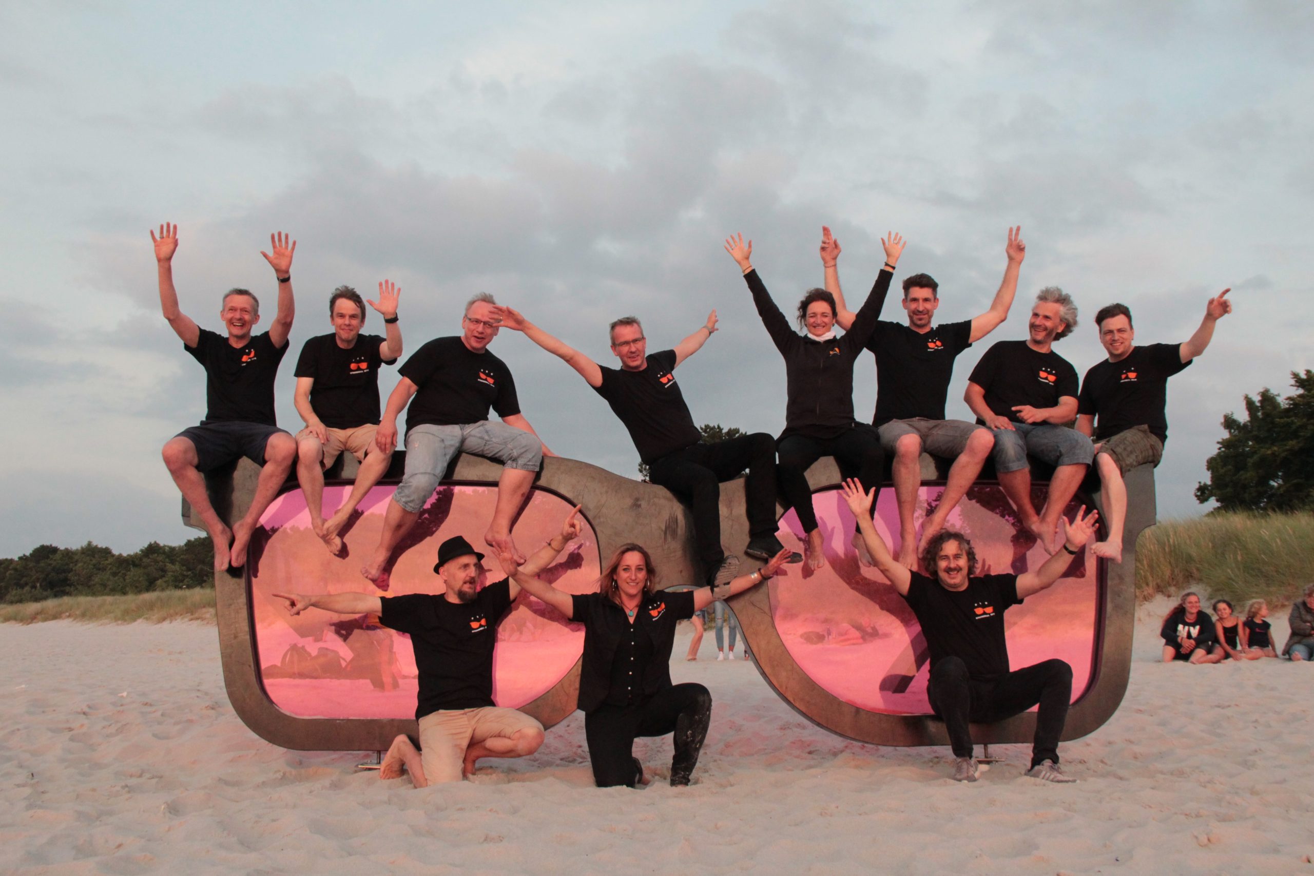 Apropos Tourroutine; in Zingst begannen wir bereits am frühen Nachmittag, fanden ein fluffiges Ambiente, mitten drin Christoph Herrmann & Familie und wir lösten beim lokalen Getränkeverhändler einen Ansturm auf die vollen Gläser aus. Mit ihm dürfen wir im nächsten Jahr wieder planen, rief er hocherfreut aus. Die frühe Anfangszeit brachte uns noch bei Sonnenlicht an den Strand. Wo wir unbedingt das Bandfoto auf der Zingster Brille nachholen wollten, mit vollständiger Besetzung. Wer genau nachsieht, wird feststellen, dass wieder jemand fehlt. Franzi war an dem Tag nicht offroadtauglich.
