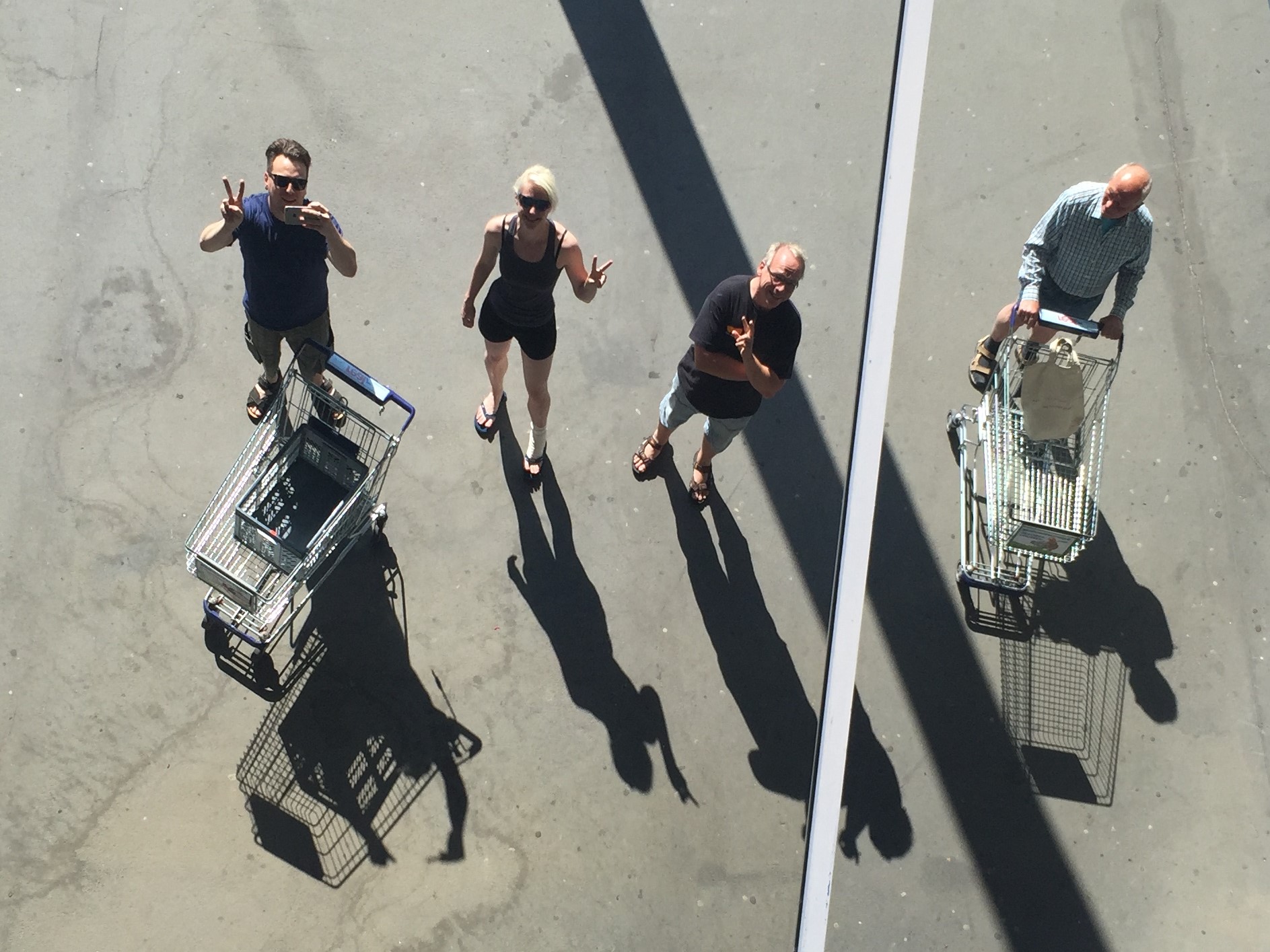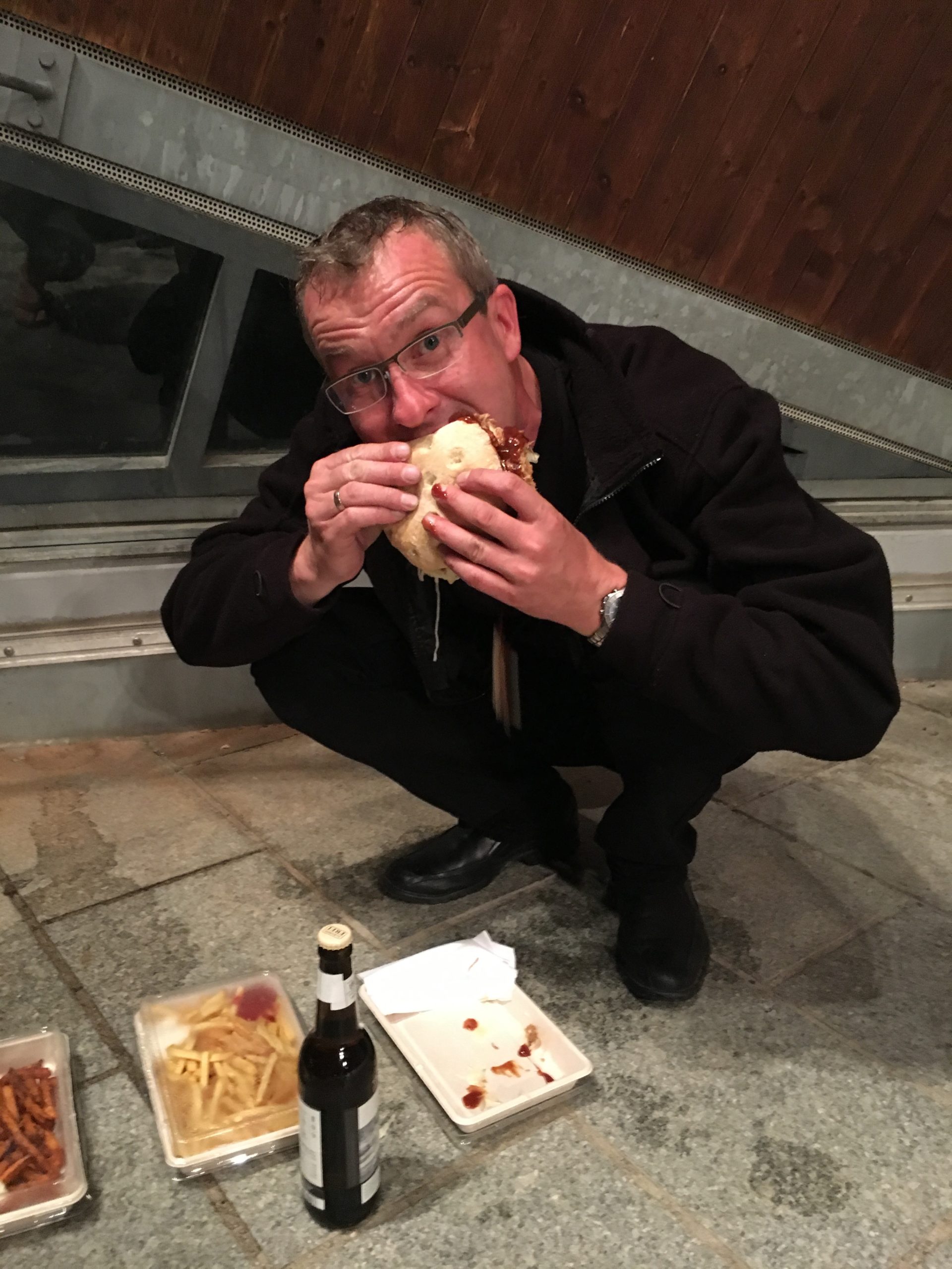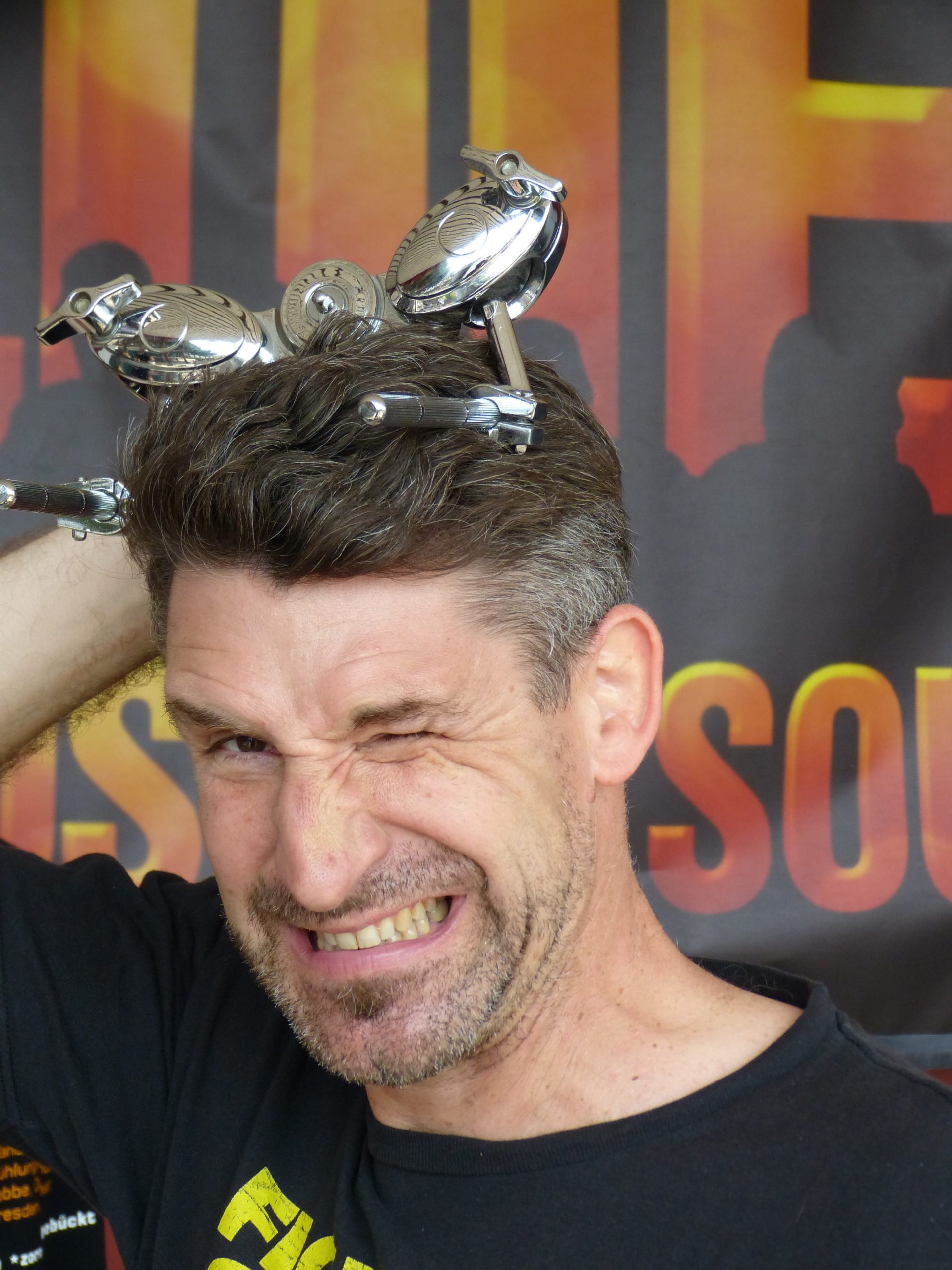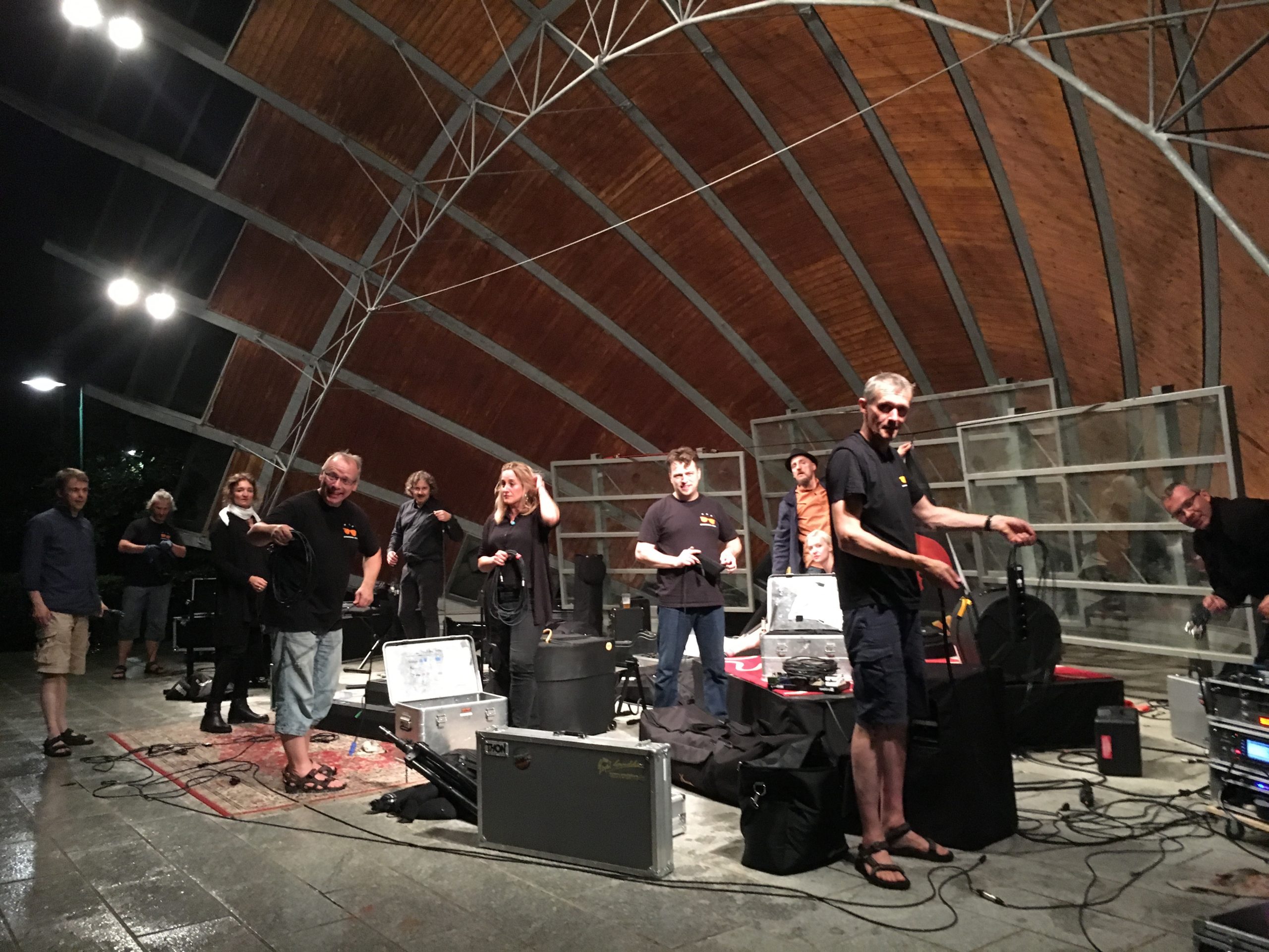 Apropos Tourroutine; in Zingst begannen wir bereits am frühen Nachmittag, fanden ein fluffiges Ambiente, mitten drin Christoph Herrmann & Familie und wir lösten beim lokalen Getränkeverhändler einen Ansturm auf die vollen Gläser aus. Mit ihm dürfen wir im nächsten Jahr wieder planen, rief er hocherfreut aus. Die frühe Anfangszeit brachte uns noch bei Sonnenlicht an den Strand. Wo wir unbedingt das Bandfoto auf der Zingster Brille nachholen wollten, mit vollständiger Besetzung. Wer genau nachsieht, wird feststellen, dass wieder jemand fehlt. Franzi war an dem Tag nicht offroadtauglich.